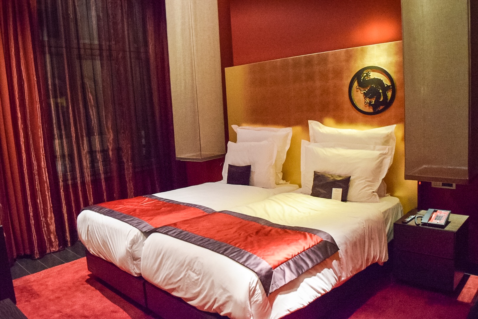 The porter proceeded to open the door to my room and my oh my, where do I start. The gorgeous red, black and gold theme from the foyer area continued in the room with charcoal flooring, red silky curtains, red and black accessories around the room. Even the telephone was not left out of the urban chic theme.